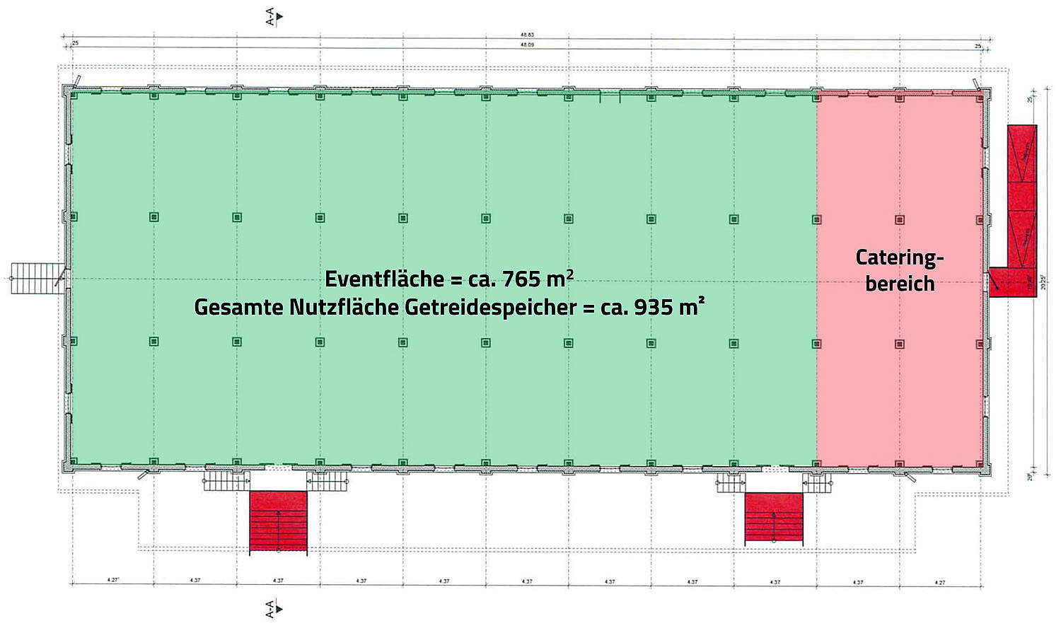 Reihenbestuhlung: max. 330 Personen (da Sichtweite) - Anzahl Nutzräume: